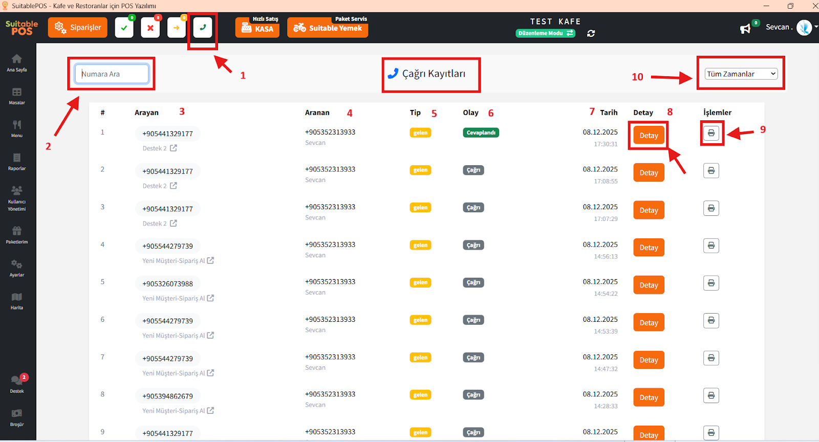 İşletmede hangi numaranın arandığı ve kullanıcı adı gösterilir.