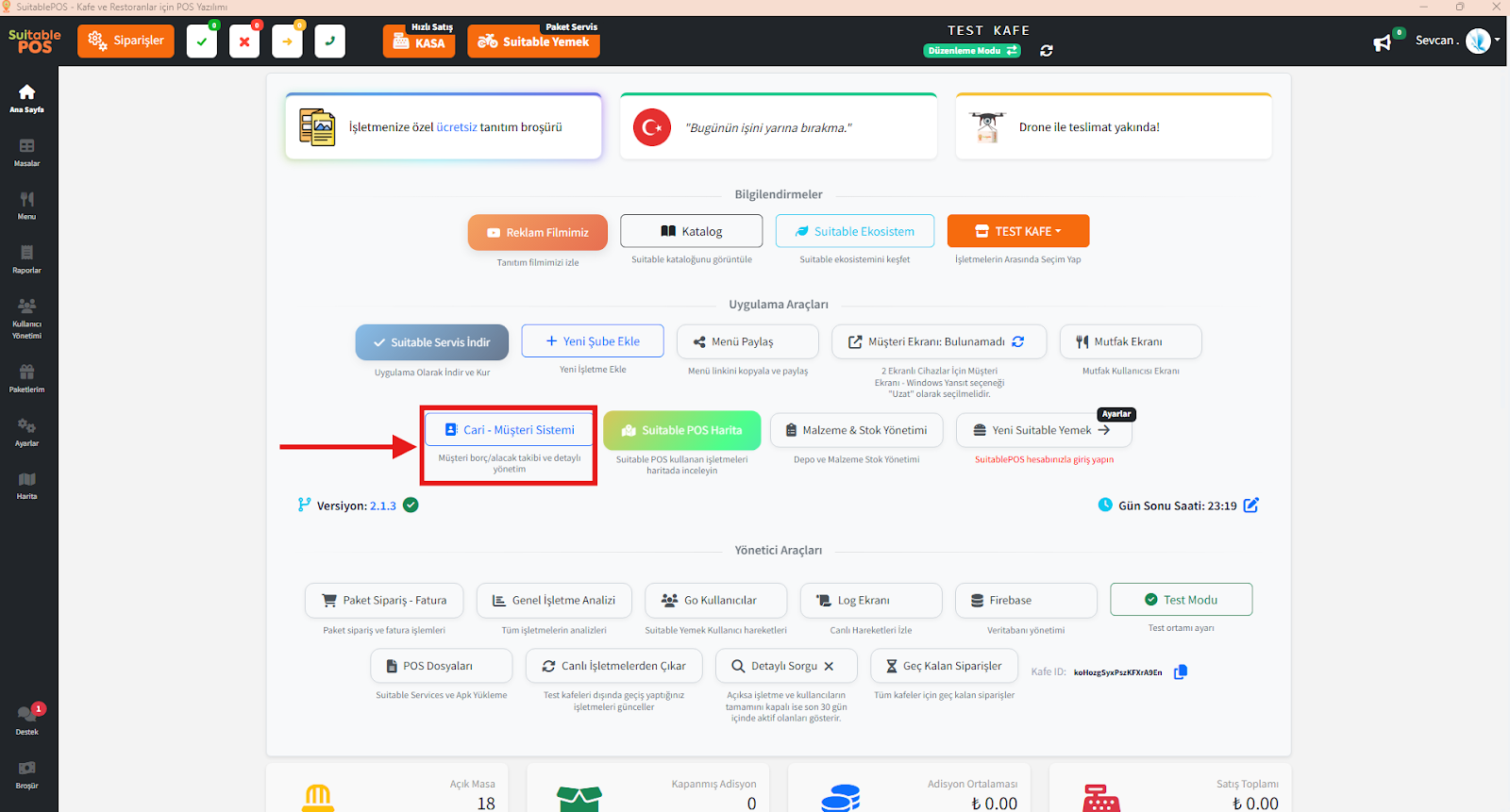 SuitablePOS'un ana sayfası, işletmenizi yönetmenizi kolaylaştıracak birçok özelliğe sahiptir. İşte ana sayfada bulunan bölümler: